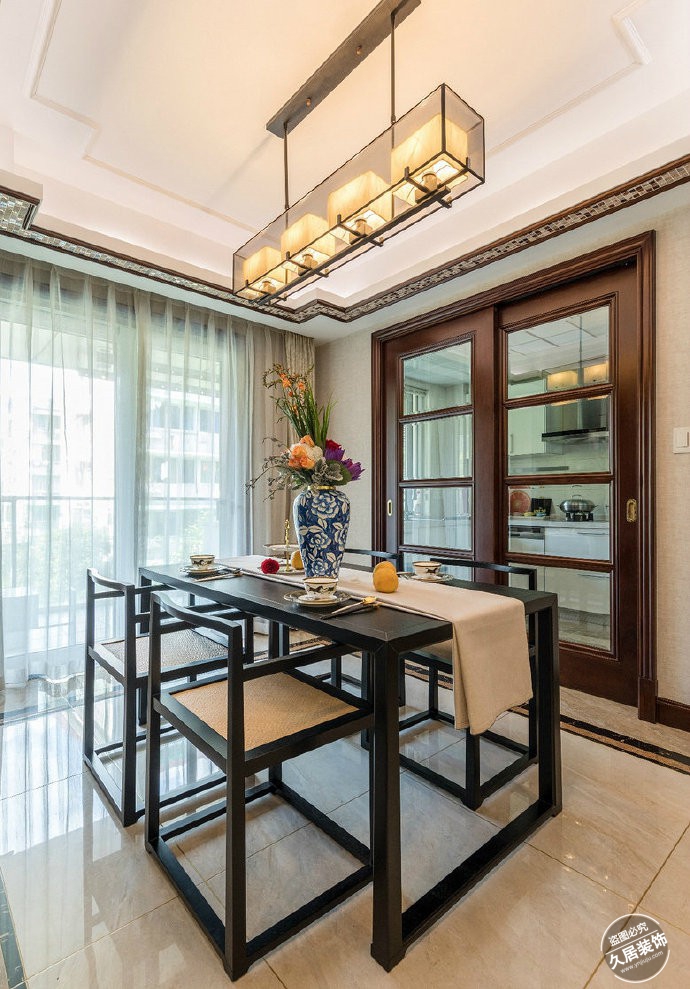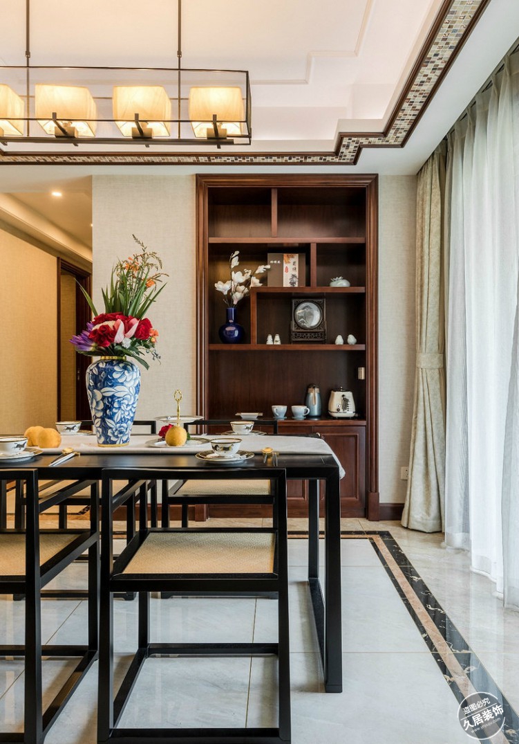 中国人自古有“没有规矩不成方圆”之说,传统的中式建筑也总是围着“方”和“圆”。如今这些理念依然延续到我们的家装中来,比如中式的家具、设计,总是喜欢用“方”的,在一些画里、装饰品里,我们又能经常看到圆。在这套案例中,餐桌椅、酒柜、吊灯、吊顶、地板砖都用到“方形”。